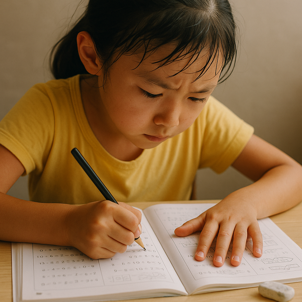 机の前で、額にうっすら汗をにじませ、鉛筆を握りしめる娘の姿。